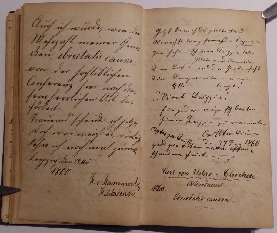 Das Kösener Archiv erhielt kürzlich als Neuzugang ein „Karzerbuch“ der Klosterschule. Der kleine leinengebundene Band im Format 16,5 x 10 cm enthält ca. 60 beschriebene Blätter mit Eintragungen aus den Jahren 1857 bis 1865, in denen die zu Karzerstrafen „verurteilten“ Schüler in Prosa und Versform mehr oder weniger kunstvoll den Grund für ihre Bestrafung eintrugen. Die Einträge sind mit den poetischen Wandgraffitti in vielen Universitätskarzern zu vergleichen. Dass als Grund für den Aufenthalt im Karzer häufig Alkohol im Spiel war, muss wohl nicht weiter betont werden ("Besoffen kam ich hierher, | Besoffen geh ich weg, | Doch kriegt ich einen Jammer, | Das wär verfluchtes Pech."). Auch der Aufenthalt im Karzer selbst war meist recht fidel, wenigstens aber erholsam ("Im Carcer ganz bequemlich, | Sitz ich bei Taback, Bier, | Jung! Brüder, seid nicht grämlich | Bezieht Ihr mein Quartier!"). Manche Gedichte nehmen Bezug auf damals bekanntes Liedgut oder Gedichte der Klassiker, so auf das Lieder der Deutschen, das Andreas-Hofer-Lied, Wedekinds „Krambambuli“, Schillers „Bürgschaft“ oder das Lied „An die Freude.“ Der Karzer selbst wird (aus bislang unbekanntem Grund) als „Leipzig“ oder „Leipzigs [heilige] Hallen“, davon abgeleitet auch „Lipsia“ bezeichnet. Offenbar verstanden sich die Insassen als eine verbindungsähnliche verschworene Gemeinschaft. Der Name Lipsia erscheint in den jüngeren Einträgen auch mit Zirkel; daneben – gleichfalls mit Zirkel – auch eine Huldigung an eine Cerevisia. Ob man tatsächlich von korporativen Zusammenschlüssen sprechen kann, sei mangels anderer Quellen vorerst dahingestellt. Sicher ist, dass regelmäßige Kneipereien stattfanden, teilweise auf den Stuben, teilweise in benachbarten Ortschaften wie Niedersachswerfen („Es war Sonntag [...], als wir zu ca. 14 Mann nach Saxwerfen zogen, um des Biers in Uebermaß zu genießen. In Ausführung dieses Vorsatzes zeichnete sich vornehmlich meine Wenigkeit aus. Als die Kneipe aufgehoben war, wußte ich schon nicht mehr, daß überhaupt eine ihre Existenz gehabt hatte."), alles in allem aber wohl eher formlos.
