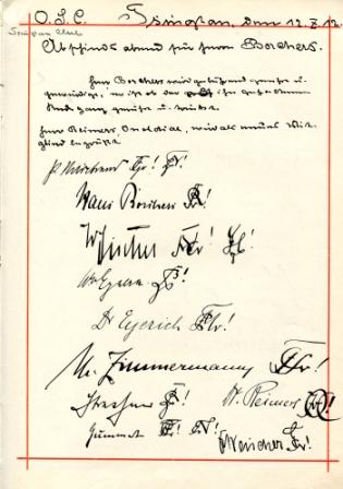 Die nebenstehend abgebildete Seite stammt von einem Abschiedsabend für den Heidelberger Rhenanen Hans Borchers im Tsingtau Club am 12.10.1912. Borchers (1887-1972) war seit 1911 Gerichtsreferendar am Kaiserlichen Gericht in Tsingtau. Er machte später ähnlich wie Ulrich von Hassell Karriere im Auswärtigen Amt, unter anderem als Legationssekretär in Kopenhagen, Gesandtschaftsrat in Wien und Konsul in Cleveland. In den Jahren 1933 bis 1941 war er deutscher Generalkonsul in New York. - Als neues Mitglied wurde "Herr Reimers Onoldiae" begrüßt, ein Marinestabsarzt aus Kiel. Er starb noch im gleichen Jahr in Ostasien.